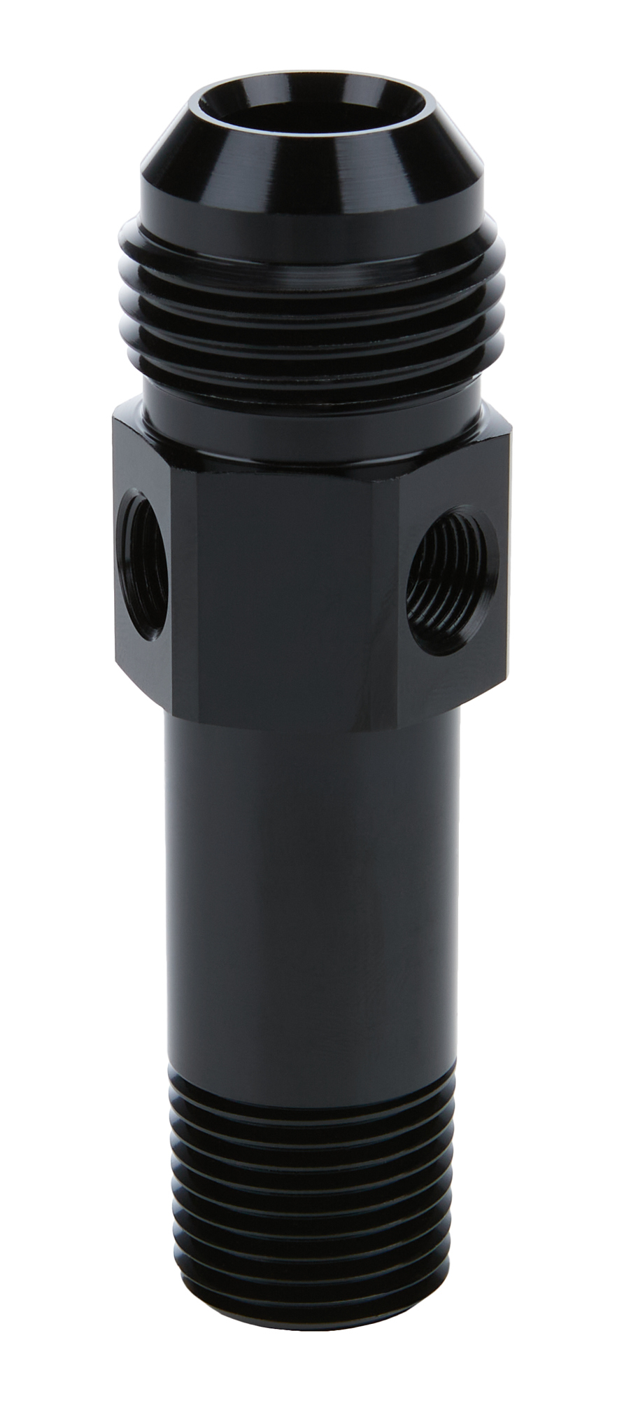 EXTENDED OIL INLET – STRAIGHT – 12 AN MALE TO 1/2 IN NPT MALE – 3 IN LONG – 1/8 IN NPT FEMALE PORT – ALUMINUM – BLACK ANODIZED – EACH